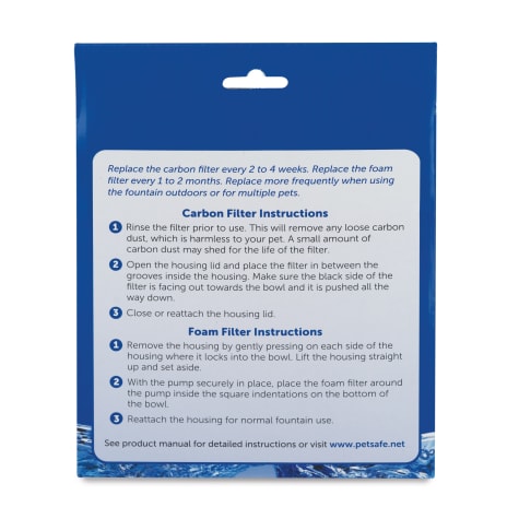 A drinkwell pet fountain helps to encourage pets to drink more and to stay hydrated with the allure of clean and fresh tasting water that is constantly flowing. Drinkwell original fountain the drinkwell original fountain holds 50oz of filtered water. The fountain comes included with a carbon filter that filters out bad taste to provide fresh drinking water. Designed specifically to fit a variety of drinkwell pet water fountains these high quality filters feature a duo density polyester pad that catches hair and debris while the activated carbon helps make sure every refreshing sip of water your precious pet laps up tastes.